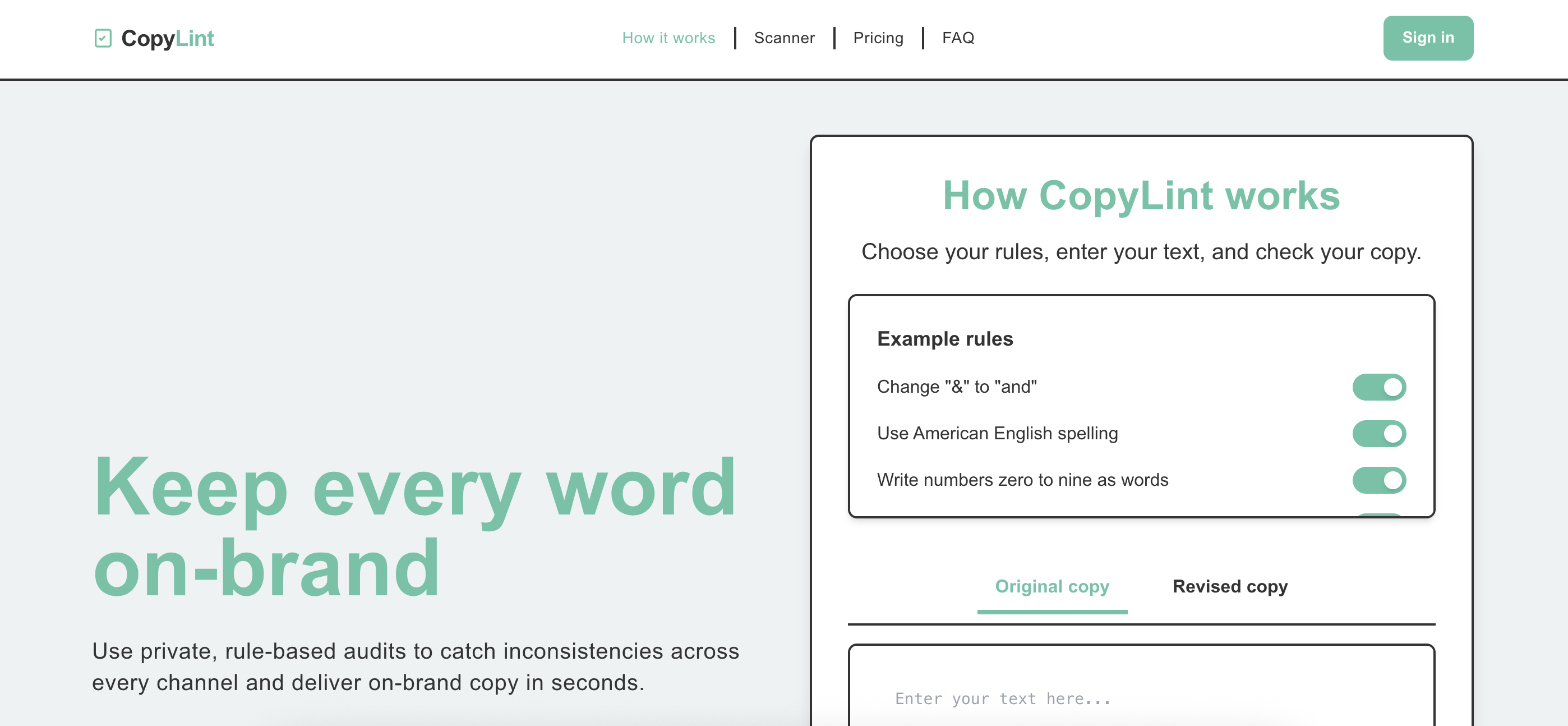 CopyLint is a privacy-first copy checker that helps teams keep their communications on-brand. Define custom rules (or use presets) to align terminology, style, and formatting - all in your browser.